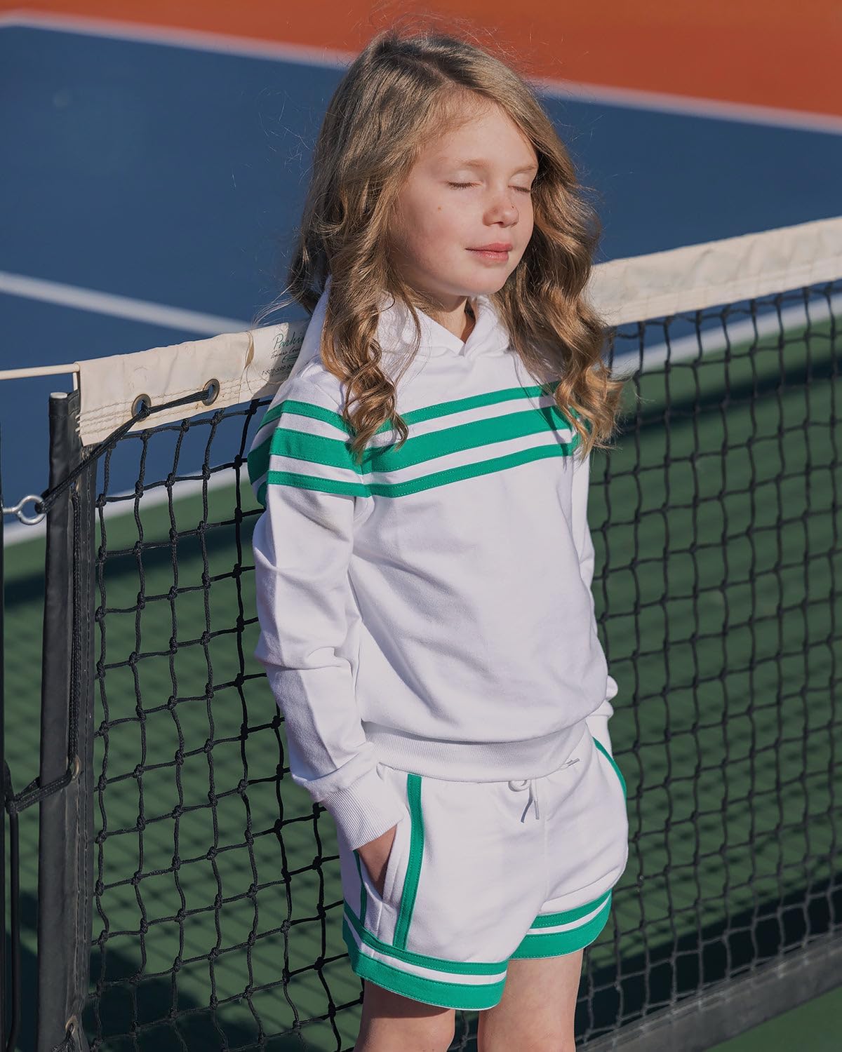 This soft, organic cotton French terry short is easy to pull on and designed with comfort, practicality, and style. It features athletic stripes, side pockets, and an elastic waistband with a faux drawcord. It pairs well with our matching hoodie for a charming, sporty look.