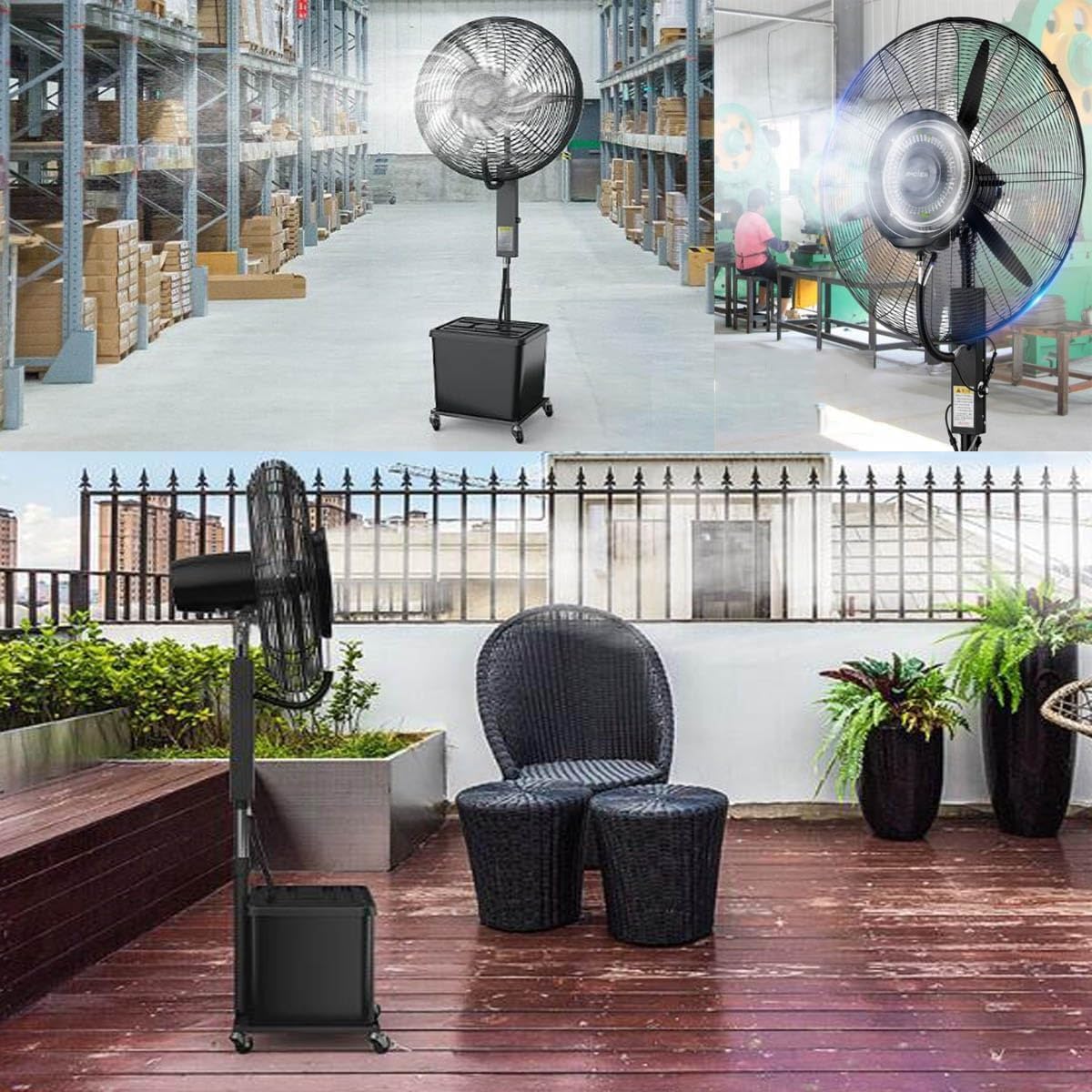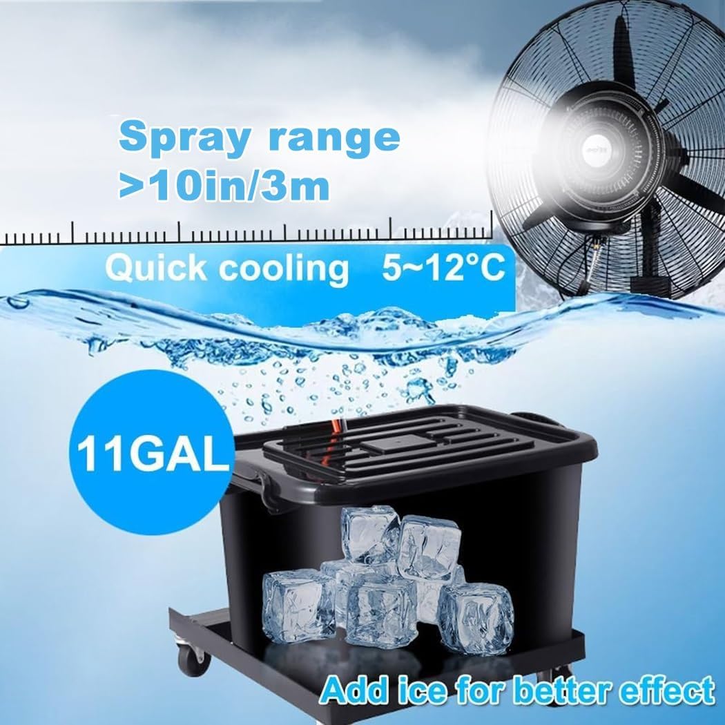 Our misting fan is a kind of item that cools by using the heat of vaporization that takes away the heat of the surroundings when water evaporates.Used in factories, outdoor restaurants, residential courtyards, medium-sized offices, exhibition halls, clubs, home shopping malls, electronic entertainment facilities, internet cafes, commercial facilities, gymnasiums, sports facilities.Powerful fan pedestal fan function● Ventilation of factories and warehouses.● Dust and the air in the dust are discharged.● The barn is ventilated and dry.● Uses a copper core motor with excellent durability and safety.● Built-in thermal protector to prevent motor stacking.Specifications●Name: Industrial mister fan●Colour: Black●Voltage: 110v●Power: 260w, 350w●Wind adjustment: 3 gears●Spray adjustment: Adjustable●Spray distance: 3-10m●Water tank capacity: 42L●Motor type: Copper core motor●Plug type: Three proof●Blade diameter: 25.6 in(65 cm), 29.6 in(75 cm)Packing listFloor fan + water tank + manual
