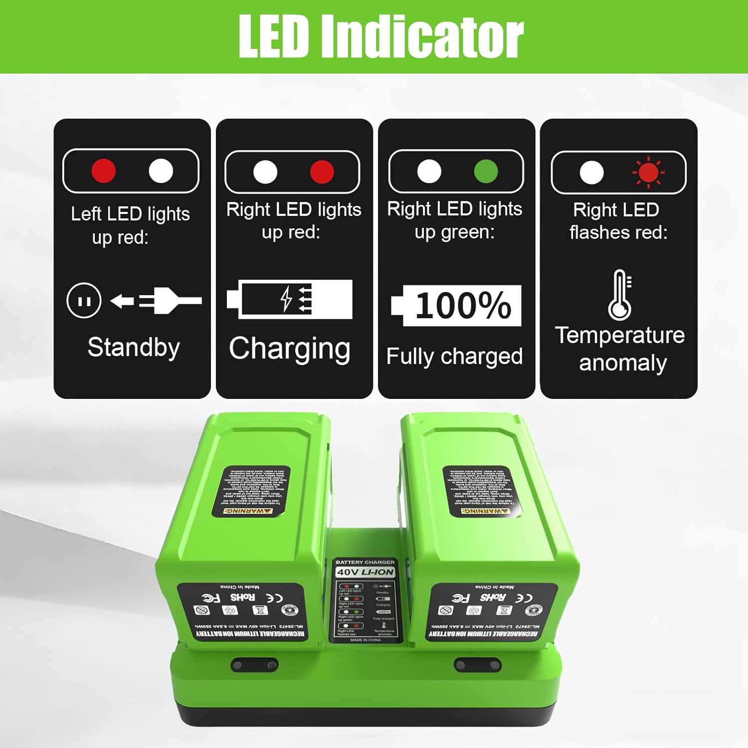 | Warranty Description | 30 days money back, 1-year warranty. 24*7 hours prompt customer service. If you have any questions about the replacement Greenworks 40v Charger, feel free to contact us via order, we'll try our best to give you a satisfactory answer. |