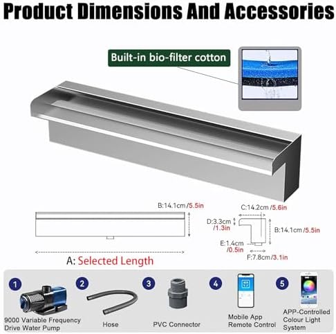 Transform your outdoor space with our stunning waterfall spillway, designed to elevate the aesthetics of any poolside, garden pond, patio, or rockery. This elegant fountain not only enhances the visual appeal of your surroundings but also creates a serene atmosphere, perfect for relaxation and enjoyment. Whether you're hosting a gathering or seeking a tranquil retreat, this fountain serves as an exquisite focal point. Constructed from premium stainless steel, our waterfall spillway offers durability and resistance to rust, ensuring it retains its sleek appearance over time. The innovative mobile phone control feature allows you to effortlessly manage your fountain from your smartphone, providing convenient scheduling for start and shutdown. Adjust the light color with a simple tap, eliminating the need for manual operation. The fountain's waterfall-style spout delivers a broad, gentle flow of water, minimizing splashes and enhancing the soothing sound of flowing water. Equipped with 7-color waterproof LED strips, it transforms your outdoor area into a captivating space, perfect for evening ambiance. The ergonomic design of the spout also helps to reduce water noise, allowing you to fully immerse yourself in the peaceful environment. With a lightweight design and multiple size options (23.6"L x 5.6"W x 5.5"H / 35.4"L x 5.6"W x 5.5"H / 47.2"L x 5.6"W x 5.5"H), this fountain is easy to integrate into any setting. The included 9000 Variable Frequency Drive Water Pump ensures efficient water circulation, while the low-energy LED lights provide long-lasting illumination. Enhance your outdoor experience with our waterfall spillway and enjoy the beauty and tranquility it brings to your home. If you have any questions, our dedicated support team is ready to assist you within 24 hours.