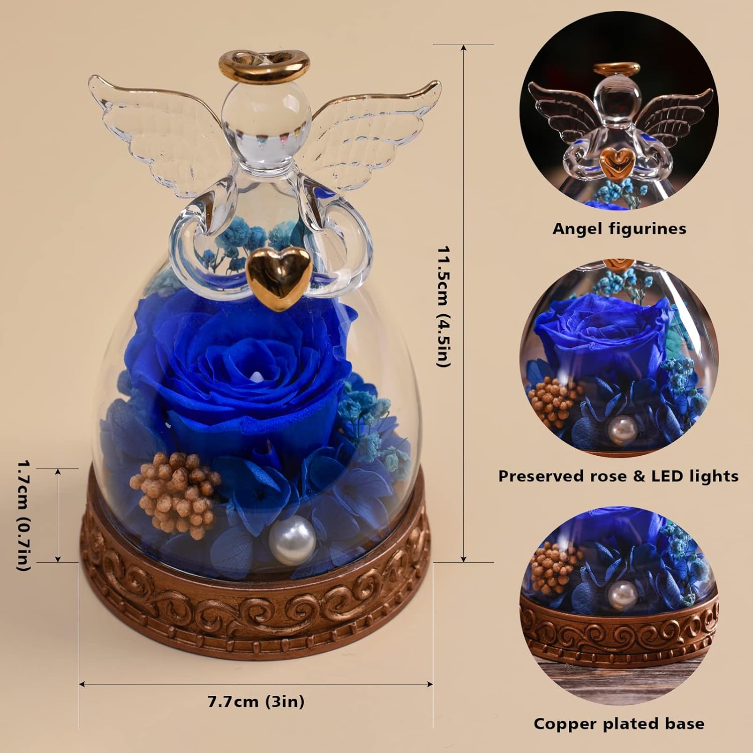 | Material Type | Copper Plated (ABS), Glass, LED Light, Preserved Rose |