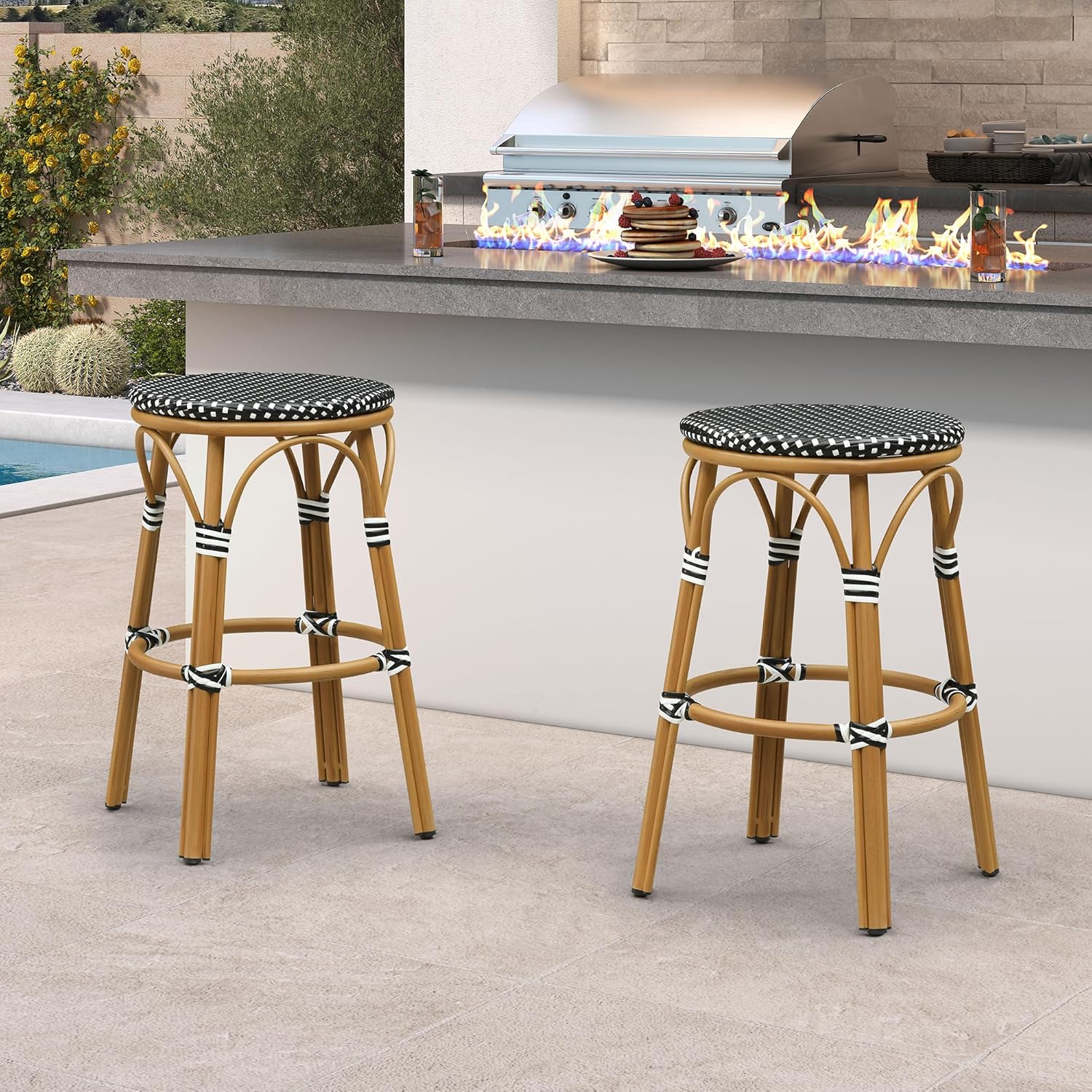 • Bamboo Print Finish: It's made of powder-coated aluminum that's weather-resistant and rust-resistant. Then a bamboo-look finish is hand applied to make these aluminum bar chairs look bamboo.