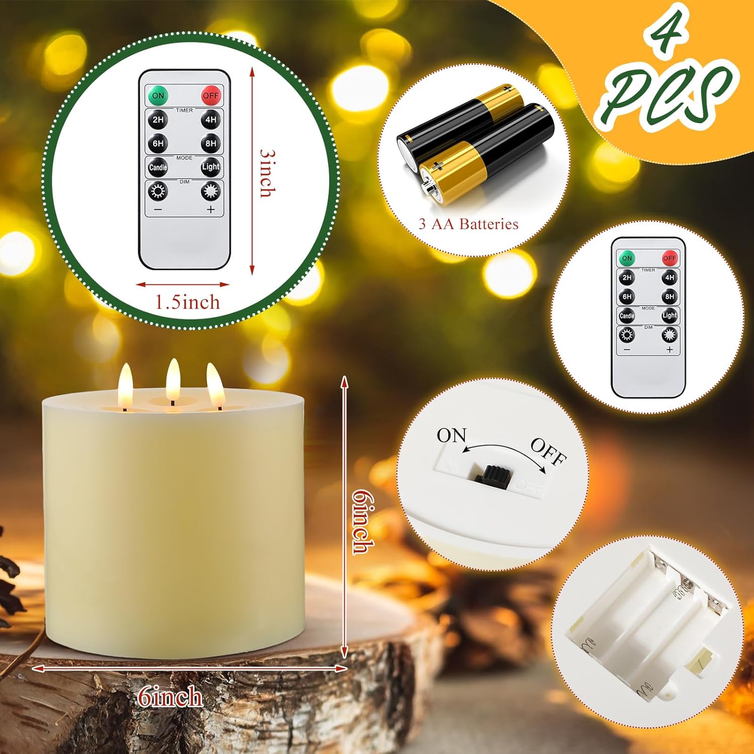 Features: Portable and ease of use: The real wax flameless candles are not just practical but are also designed to be portable. Whether you're shifting from one room to another or traveling, these candles can be transported with ease. They provide a warm glow wherever you go, ensuring that you always have a pleasant atmosphere around you. Elegant centerpiece: Equally, the 3 wick candles battery operated conduct a charming and elegant appeal as a centerpiece. Their exquisite look and lifelike texture bring in a touch of sophistication and tranquility to your space. They catch attention but not overpowering, thus blending with any decor setting. Specifications: Main material: waxColor: as shown in the pictureSize: about 6 inches/ 15 cm in bottom diameter, 6 inches/ 15 cm in heightPackage includes: 4 x Flameless candles2 x Remote controlsNotes: Manual measurement, please allow slight errors on size. The color may exist a slight difference due to different screen displays. Please note that the battery is not included in the package.