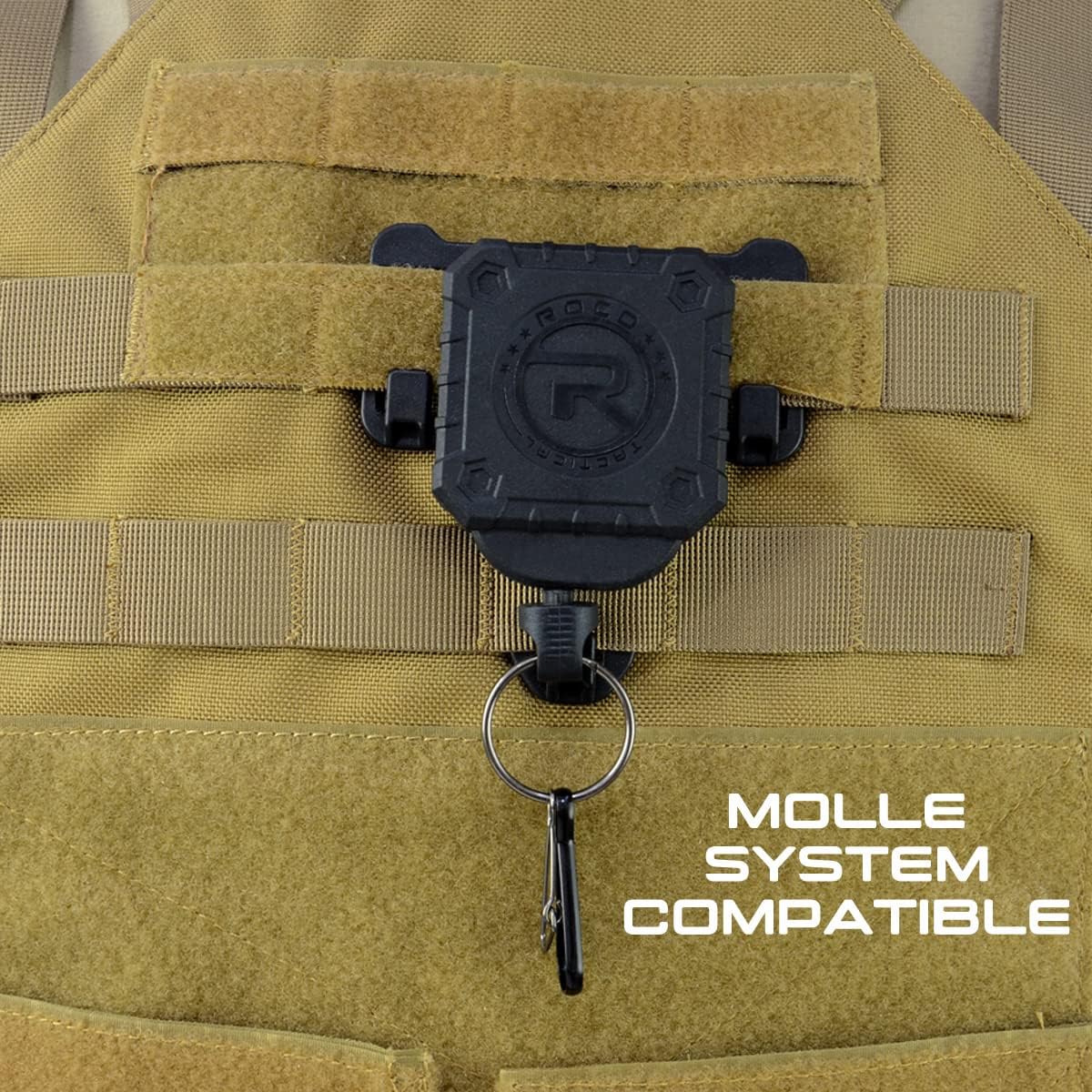 ROCOTACTICAL Military Tactical Gear Retractor, Molle Tactical Gear Tether, Retractable key/multi-tools Holder belt loop and Molle Clip Included. Polymer injection molded casing, Strong kelvar cord and special spring with 0.6 kg force contain with 1 meter lengthRetractable force lanyard for hanging flashlight light / tools / phones etc. Self Retractable ID Badge Holder Key Reel, Heavy Duty Carabiner KeychainPrevents loos of tools for military or law enforcement personnel, hunting, outdoor activities Molded Double Handcuff Case, Hidden Snap Nylon Cuff Case Pouch, made of 1680D nylon, for duty belt