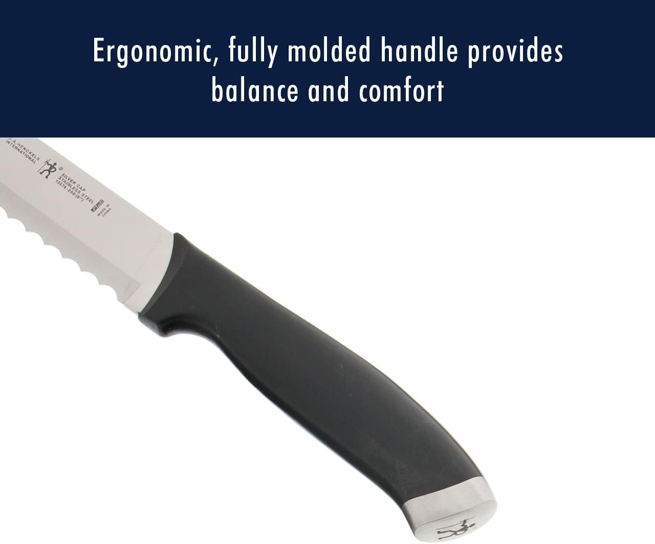 The Henckels International Silvercap 14-pc Knife Block Set gives home chefs high quality, low maintenance knives to accomplish everyday tasks with ease. Thanks to their handy micro-serrated edge, the blades never need to be sharpened. The all-rounder 8" Chef's Knife is ideal for chopping herbs and dicing onions while the 5" Serrated Utility Knife cleanly slices through tomatoes. Efficiently mince garlic with the 5" Hollow Edge Santoku, whose blade has small indentations, aka grantons, that prevent food from sticking while cutting. The knives offer single-piece, precision-stamped construction for long-lasting durability. Fabricated from superior stainless steel, the lightweight knives are easy to maneuver. The traditional, triple-riveted handle provides balance and comfort as you chop. With their stylish, stainless steel endcaps, you'll want to show off your Silvercap. Henckels International makes essential kitchen tools every home chef needs. From steak knives to spatulas, every product offers high quality at an exceptional value. Created in 1895 by Zwilling J.A. Henckels, this value-driven brand guarantees the same durability, design and ease of use for which the global company is known. Equip your kitchen with expertise with Henckels International.