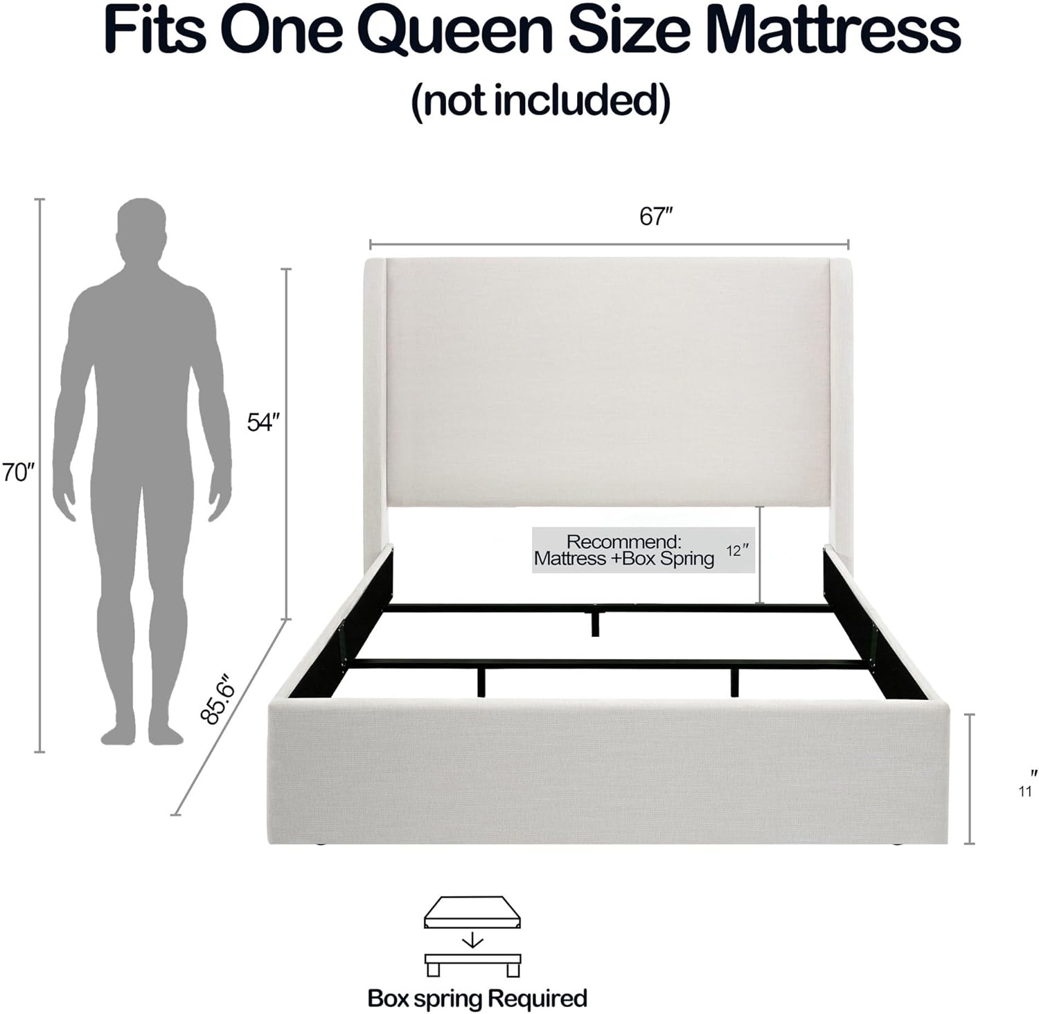 Product Name: Upholstered Wingback Bed with 54" High Headboard Main Color: Ivory Main Material: Fabric + Metal Filler: Foam Product Style: American Design, Contemporary, Luxury Use Case: Bedroom Bed Size: Queen Bed Type: Bed Frame Box Spring Requirements: Box Spring Required Upholstery Material: Chenille Bed Frame Material: Metal Product Dimensions Assembled Length (in.): 85.60 Assembled Width (in.): 67.00 Assembled Height (in.): 54.00 Product Weight (lbs.): 87.3 Package Size Length (in.): 63.60 Width (in.): 19.5 Height (in.): 10.04 Weight (lbs.): 94.14