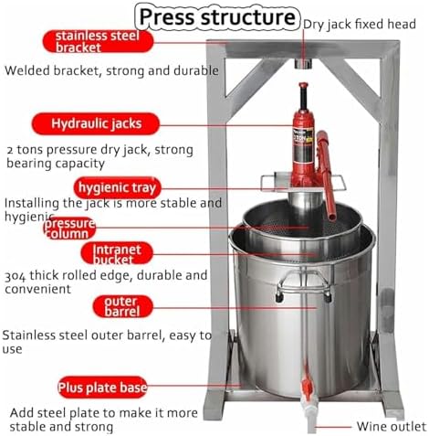 Introducing our versatile juice and oil extractor, the perfect addition to your kitchen for healthy living. Crafted from high-quality 304 stainless steel, this durable press is built to last, resisting corrosion while delivering exceptional performance. This multi-functional press is ideal for extracting fresh juices and oils from a variety of fruits and vegetables, making it an invaluable tool for health enthusiasts and cooking aficionados alike. Whether you want to create refreshing beverages or flavorful oils, our product ensures you can enjoy the freshest ingredients right at home. With options for outer bucket capacities of 12L, 22L, or 36L, this press accommodates different batch sizes to suit your needs. It boasts a remarkable maximum pressure of 3 tons (6613.87 lbs) and a load capacity of approximately 150 kg (330.69 lbs), making it suitable for extracting even the toughest fruits and vegetables. The pressure plate's thickness of 5 mm (0.2 in) guarantees reliable and efficient performance. Using the press is straightforward: assemble the outer bucket and filter bucket within the sturdy bracket, add your cut fruits or vegetables into the inner bucket, and position the pressure plate. Then, place the sanitary tray on top, install the hydraulic jack, and you're ready to enjoy fresh extracts in no time. For optimal results, ensure that fruits and vegetables are appropriately sized before pressing, and always adjust the oil return valve to maintain efficiency. Remember to keep the jack clean and lubricated, and store it vertically when not in use. Note: The outer bucket and hydraulic jack are shipped separately to ensure safe delivery. Please avoid using the press for hard substances like nuts, as it is designed specifically for softer produce. Elevate your culinary creations and embrace a healthier lifestyle with our efficient juice and oil extractor—your go-to solution for natural flavors and nutrition!