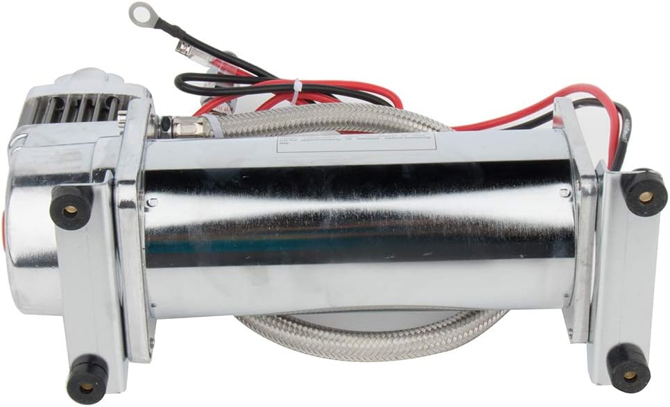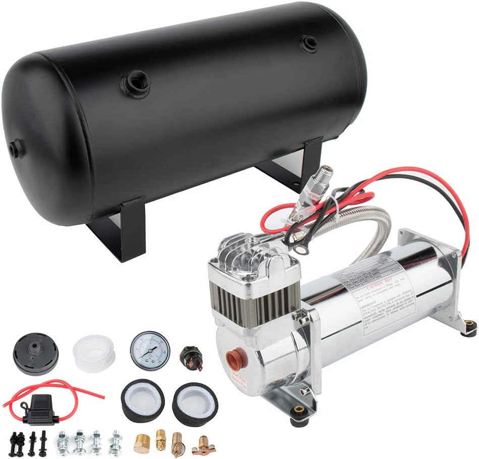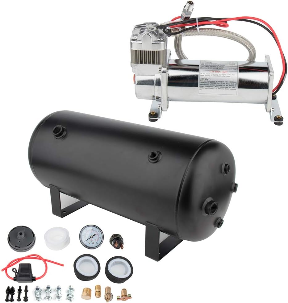 PACKAGE: 1* 200 PSI 12V Air Compressor1* 5 Gallon Air Tank1* Hose1x Fuse1* Pressure Gauge1* Mounting HardwareSPECIFICATION: Air Compressor Power:12 VoltsMaximum Pressure:200 PSIDuty Cycle (100 PSI):100%Maximum Current Draw:23AmpFlow Rate (0 PSI):1.7 CFMMaintenance Free:YesLength:10-¾"Width:4"Height:6-¾"Air Tank Tank Capacity:5 Gallon(18L)Color:BlackAir Pressure Gauge Included:YesMaximum Pressure:250 PSIWorking Pressure:200 PSITotal Ports:8Front Ports:1 x ¼", 1 x ½"Bottom Ports:1 x ¼"Left Side Ports:1 x ¼"Right Side Ports:3 x ¼", 1 x ½"