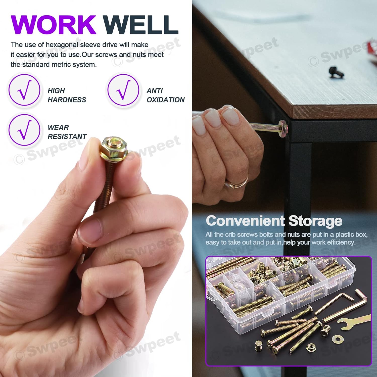 ๐ฏ Swpeet 253Pcs M6 x 25/35/45/55/65/75mm Zinc Plated Crib Hardware Screws, Hex Socket Head Cap Crib Bolt and Barrel Nuts Flat Washer and Flange Nuts with Threaded Insert Nuts ๐ฏ WHY CHOOSE US? ๐ฅ1, Crib Hardware Screws ๐ซ M6 high quality barrel bolt nuts kit is ideal for repairs and replacement. This set of barrel bolts nuts can fit for many different things, such as beds, chairs, cots, crib, sofa and different kinds of furniture. ๐ฅ 2, Flange Nuts ๐ซ Flange Nuts, Designed to stand off the material to allow easy weld penetration,widely used to industrial machine. ๐ฅ 3, Threaded Insert Nuts ๐ซ Suitable for soft woods of pine, plywood, fiberboard, etc, work ferfectly on the furniture combination. Pieces Pack of Furniture Screws Threaded Inserts for Wood Furniture. ๐ฅ 4, A Great Value Packaging and Easy To Us ๐ซ All the crib screws bolts and nuts are put in a plastic box, In order to complete the 3 different furniture screws, you only need to buy one time to get it, saving your time and energy. ๐ฅ 5, High Quality ๐ซ Color: Color zinc, adopting color zinc plated to prevent rusting. Material: Made of high quality carbon steel, high hardness and perfect wear resistance, standard internal hex socket, without burr, smooth, non-slip. ๐ฏ Specifications: ๐ฅ Material: Carbon Steel ๐ฅ Surface treatment: Zinc plated ๐ฅ Size: M6 ๐ฅ Model: M6x25mm,35mm,45mm,55mm,65mm,75mm ๐ฏ Package included: ๐ฅ M6ร25mm -------- 10Pcs ๐ฅ M6ร35mm -------- 10Pcs ๐ฅ M6ร45mm -------- 10Pcs ๐ฅ M6ร55mm -------- 10Pcs ๐ฅ M6ร65mm -------- 10Pcs ๐ฅ M6ร75mm -------- 10Pcs ๐ฅ M6 Barrel Nuts -------- 60pcs ๐ฅ M6 Flat Washers-------- 60Pcs ๐ฅ M6 Flange Nuts-------- 50Pcs ๐ฅ M6 Inserts Nut -------- 20Pcs ๐ฅ M4 Allen Wrench -------- 1Pcs ๐ฅ M6 Allen Wrench -------- 1Pcs ๐ฅ M6 Flat Wrench ------ 1Pcs ๐ฅ Intotal 253Pcs