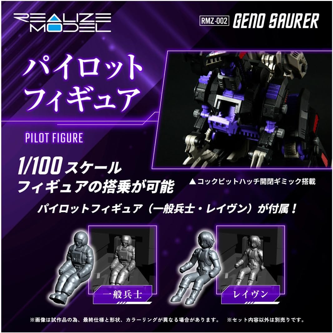 The "New GENO SAURER" is the first refined version since the moving kit was released in 2000, with improved resolution and the appeal that only an action plastic kit model can offer. The cold-blooded gene was inherited. While following the design of the kit originally released in 2000, the range of motion and proportions have been reconsidered, taking into account the flow from head to tail that is unique to a bipedal dinosaur. The impressive tail section that opens when firing the charged particle cannon is reflected in the design as a realistic addition that complements the visuals of the anime. Each part has a movable gimmick: - The approach is unique to action plastic kits, which allows for a range of motion that enhances the realistic movements of dinosaurs. - It is possible to express various poses such as looking up, turning around, and roaring. - The torso and neck have built-in retractable joints, allowing for natural movements such as turning around of the upper body. - The base of the shoulders can be pulled out, allowing the arms to be posed inward. - It can move in two different positions: upside-down and upside-down. It can also pose with its feet directly under its body when walking or running, just like a dinosaur. - The base of the tail slides, and the joints are divided into smaller sections, expanding the range of motion in all directions. Natural poses are possible from the neck to the tip of the tail. Detailed movable gimmick: - It is equipped with movable gimmicks, even in the details of each part and the toes. In addition, interchangeable head parts are included, allowing for a variety of expressions. - The newly designed leg vernier cover can be opened or closed. - The claw parts on the legs can move independently. - The toe parts of the arms can move independently. - By replacing the head weapon, it is possible to switch between mass-produced and special machines. - The base can rotate left and right, and the elevation angle can be adjusted up and down. Reproducibility in the anime: - It features movable gimmicks that enhance the expression of memorable scenes such as the "charged particle cannon firing form" and "hovering form" depicted in the TV anime. - The charged particle cannon firing sequence, the anchor is movable, and the cooling unit opens and closes, allowing you to recreate scenes from the anime. - It is possible to pose it in the hovering motion mode seen in the anime. - The cockpit hatch has an opening and closing gimmick, and also comes with 1/100 scale pilot figures (Ban & Fine, and a regular soldier)! Optional production parts: - Comes with special parts that allow you to realize your fantasies and enhance the reproducibility of famous scenes from the anime. - Reproduces the state of firing immediately after charging the charged particle cannon. Effect parts that can be posed are included. - Effect parts are included that can recreate the firing state of the long-range pulse laser rifle.