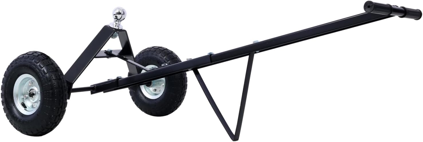 Material: SteelColor: BlackDimensions: 47" L x 24" WWeight: 600 lbs max tongue weightMounting Type: Hitch BallPackage Includes: Trailer Dolly with Pneumatic TiresCountry of Origin: United StatesNotes: For outdoor use; avoid exceeding weight capacityPurpose: This trailer dolly is engineered to simplify the movement of lightweight trailers, boats, and utility vehicles in confined spaces. Its robust steel construction and pneumatic tires ensure smooth, stable operation. The 44" handle offers superior leverage, while the 1-7/8" hitch ball is compatible with 2-inch trailers. powder-coated steel resists corrosion, making it suitable for outdoor use. Ideal for homeowners, RV enthusiasts, and boaters seeking a reliable, easy-to-use solution for trailer
