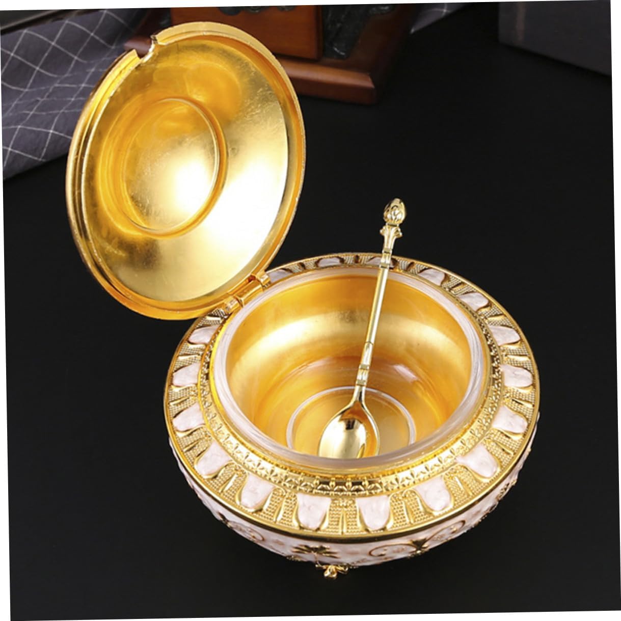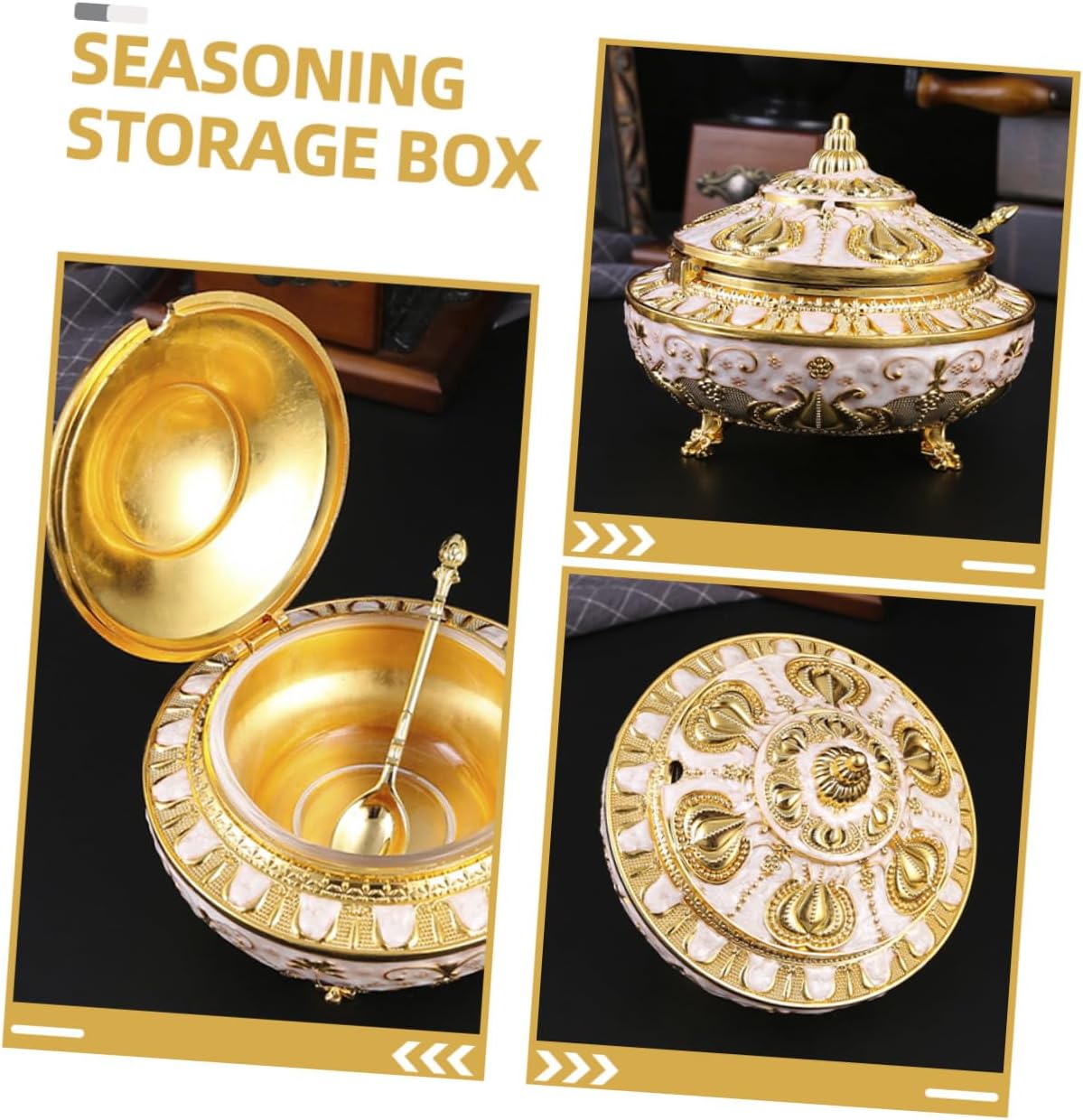 Package Include 1 x Spice Jar Characteristics -Material:Metal -Color:Golden -Product Info:Tulip jar -Size:13.70X13.70X11.50cm/5.38X5.38X4.52in -The spice container is neatly arranged, organized and clear , and the spices inside are clear salt container. -Good airtightness, food is not easy to get bad. Keeps spices fresh for longer. Packaging is safe, secure and convenient pepper container. -Multi-functional Spice Container lid type design, save effort when opening and closing. Good sealing performance spice dispenser. -The spice container is made of reliable materials, stylish and beautiful in appearance, the spice container is sturdy and and odorless. -Convenient spice box has good toughness and hardness for direct contact with food salt jar with lid.Goods Informationconvenient seasoning container You can feel the convenience of life while using this seasoning jar.spice storage jars This item is a multipurpose Seasoning Box with retro design.metal spice holder Suitable for home, hotel, café, buffet, party, etc.sugar container You can store salt, pepper, chili, sauces, sugar and other condiments.condiment pot One hand press, easy to use, one hand can open the lid, cooking is