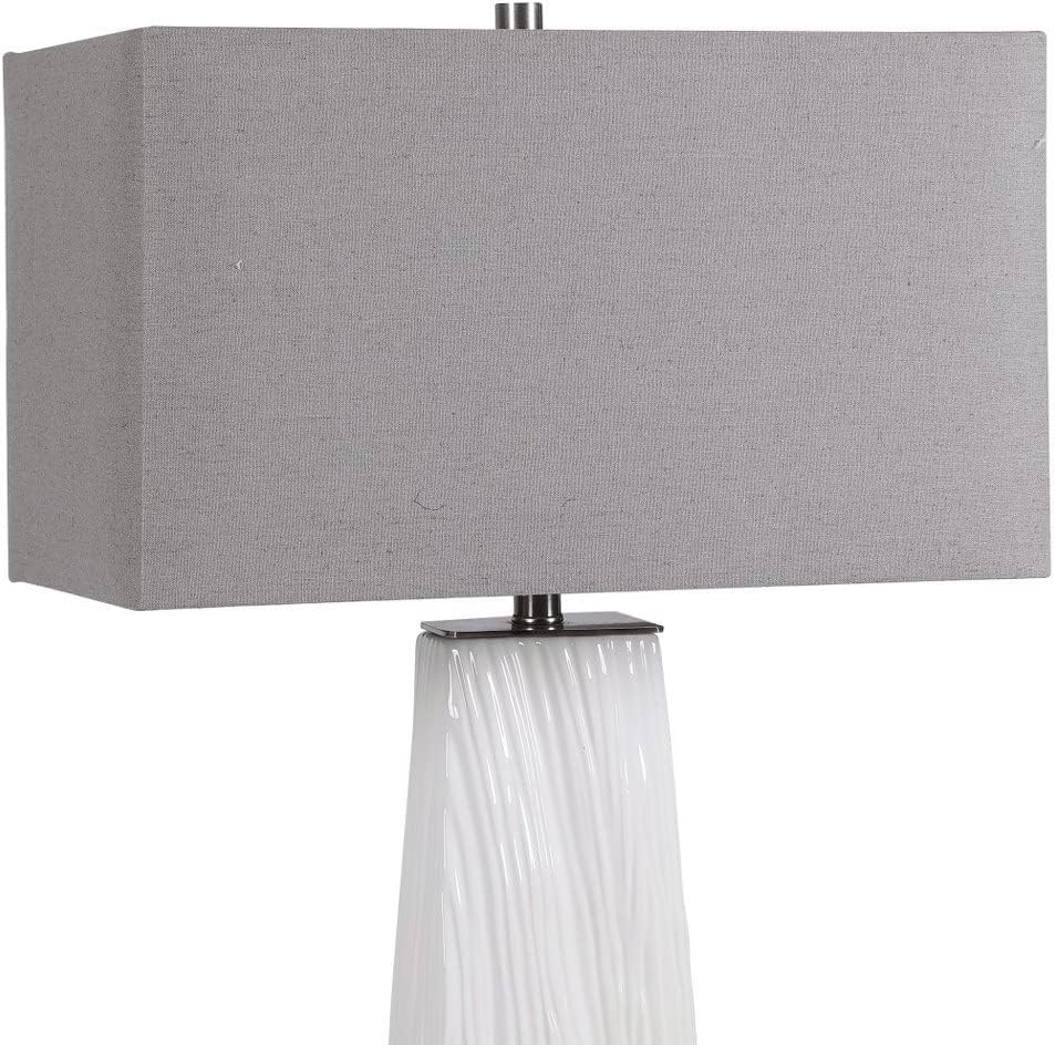 Collection: Sycamore, Material: Iron, Finish Color: Gloss White/Brushed Nickel, Width: 19", Height: 36", Depth: 11", Number Of Bulbs: 1, Wattage: 150 Watts, Dimmable: No, Moisture Rating: Dry Rated, Desc: Elegant And Versatile, This Table Lamp Features A Gloss White Ceramic Base Featuring Organic Hand Carved Details And Brushed Nickel Accents. The Piece Is Paired With A Rectangle Hardback Shade In Gray Linen Fabric With Natural Slubbing. Jim Parsons / Shade Included: Yes . ,