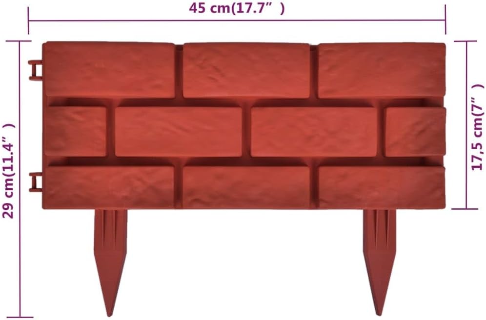 Easily partition your borders or flower beds with this decorative lawn divider. The interconnectable pieces each have two spikes that allow you to easily secure them to the ground, and together make up a total length of 16.4's. Each piece has a length of 17.7" and a height of 6.9" (without spike). Our lawn divider is made of high quality polypropylene, which offers you years of service.Features:- Delivery includes 11 pieces.- Height: 0.6 ft (without spike); 1 ft (including spike)- Total length: approx. 16.4 ft; Length: 1.5 ft per piece- Pieces interconnectable- With a brick design- Fabric: Polypropylene: 100%Specifications:- Color/Finish: Red