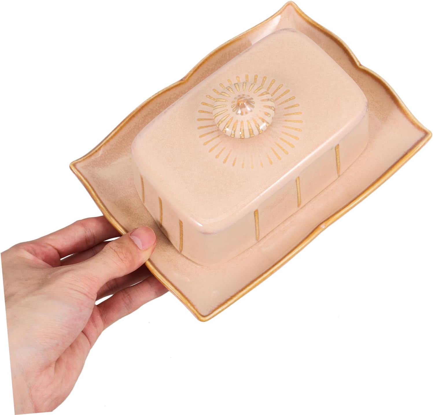 Package Include 1 x lidded butter dish Characteristics - Practical: You will find your kitchen neat and orderly after using this butter box, improving your life greatly Ceramic butter dish - Size: 19.00X14.00X8.80cm/7.47X5.50X3.46in butter keeper container -Material:Ceramic butter storage holder - Color: Khaki ceramic butter holder - Versatile: kitchen butter box is a must-have for any home, as it can be used for a variety of purposes dish with lid -Retro style: simple appearance makes it a great addition to your kitchen, delicate and practical butter dish -Multi-purpose: great for storing butter, cheese, desserts, etc. in the kitchen, keeping food fresh reusable cheese box - Excellent for storing butter and cheese: The lid keeps butter fresh in the fridge and it will prevent the taste mixed butter holderGoods Informationbutter storage container Smooth surface and corners, fine workmanship.kitchen butter holder This is a Ceramic Butter Dish, made of ceramic materials, and can be used for longtime.Ceramic butter dish The structure of the lid is to keep the butter fresh and reduce the absorption of peculiar smell