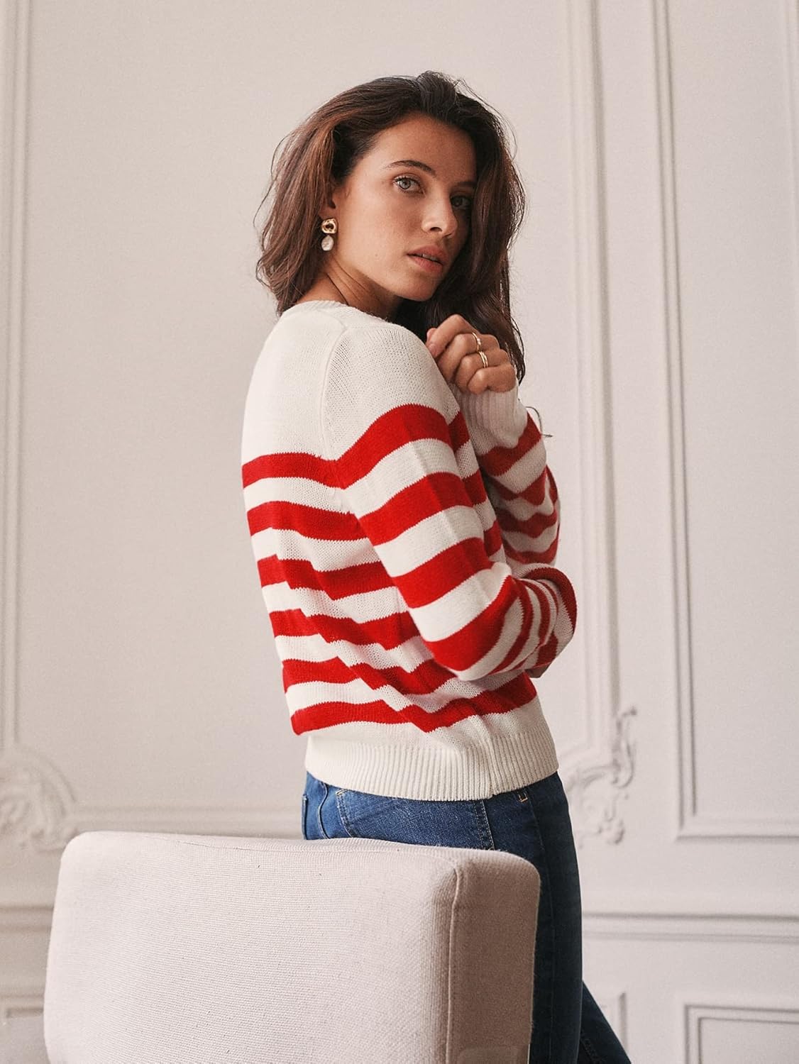 SBust : 40.2 inchLength : 20.5 inchSleeve Length : 24 inchMBust : 41.7 inchLength : 20.9 inchSleeve Length : 24.4 inchLBust : 43.3 inchLength : 21.3 inchSleeve Length : 24.8 inchColor: Red and WhiteStyle: CasualPattern Type: StripedType: PulloversNeckline: Round NeckSleeve Length: Long SleeveSleeve Type: Regular SleeveLength: RegularFit Type: Regular FitFabric: Medium StretchMaterial: AcrylicComposition: 100% AcrylicCare Instructions: Machine wash or professional dry cleanSheer: No
