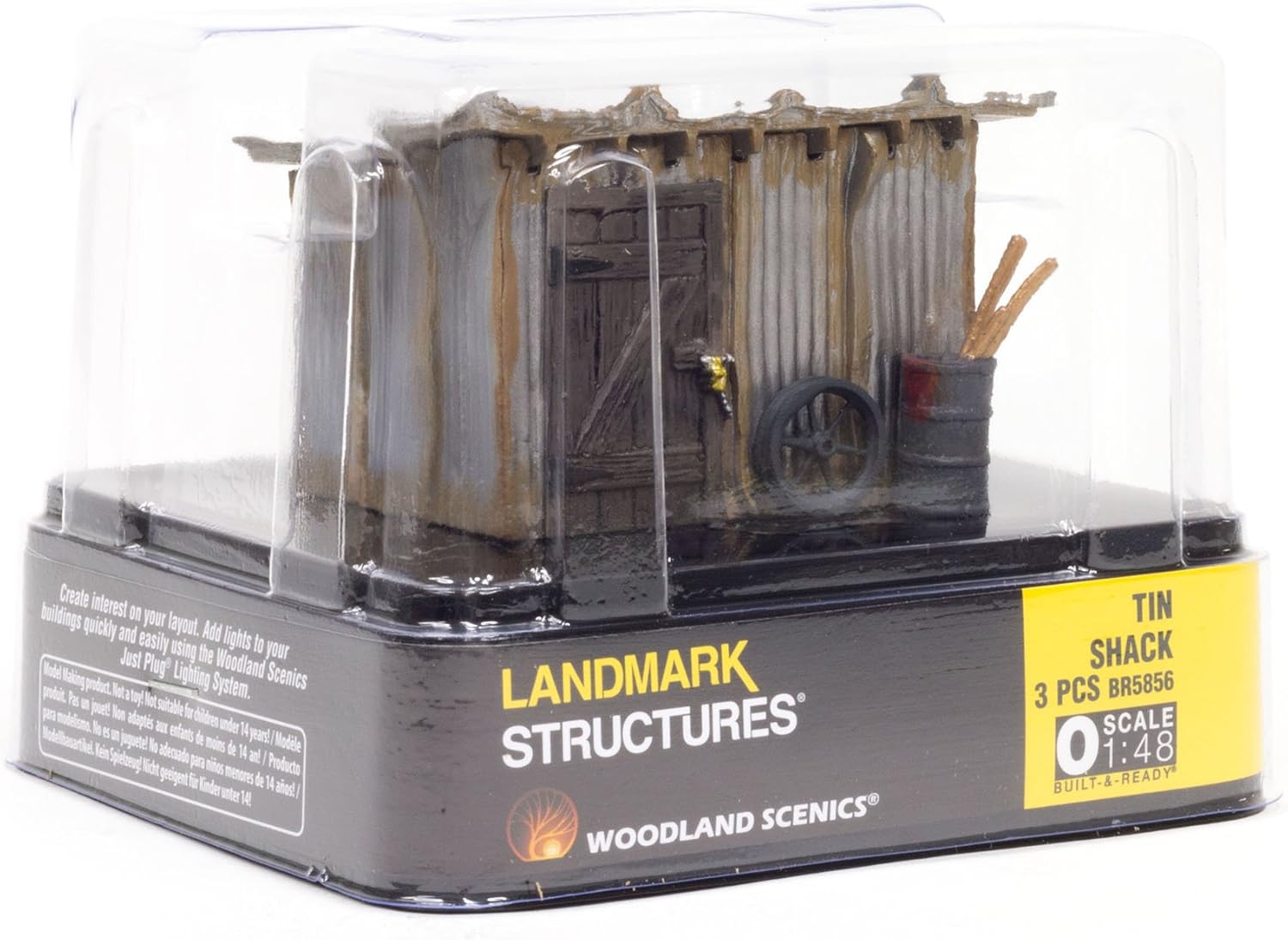 Woodland Scenics : 5856 O Gauge Tin Shack "Built & Ready" It's rusted metal walls and weather beaten door shows its true age after standing tall for nearly thirty years through the rain, sun, and snow. Building includes a corrugated metal roof and walls with a little rust, and a wooden door. A barrel of iron and an old wheel can be seen leaning against the wall. Exterior details are unattached for customized placement or addition to other structures. Add Shacks along the track or behind factories, businesses, and homes to create even more realistic detail. Approx. measurements: W x D x H 2 3/4" x 2 1/16" x 2 1/8"
