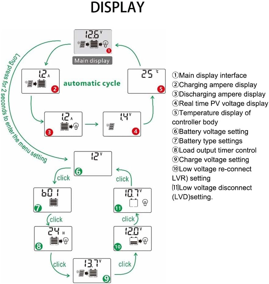 Safety Instructions: A) The solar charge controller can be charged for lead acid batteries (Sealed, Flooded, AGM, GEL),3S or 6S lithium ion and 4S or 8S lifepo4 batteries, but you need to confirm and set correct battery type as quick as possible after controller is activated. B) The battery cable should be as short as possible to minimize loss C) This controller can only use the photovoltaic panel as the charging source. Do not use the DC power supply as the charging source. D) The controller will generate heat during operation, so please keep it in cool and well-ventilated place to maintain good heat dissipation Specification: Color: Black Rated Charging/ Discharging Current:30A Max Solar Input Voltage: <50V System Voltage: 11.1V/12V/12.8V/22.2V/24V/25.6V Self consume: <10mA at 12V Float Charging: 12.3V/13.7V/14V/24.6V/27.4V/28V Discharge Reconnect Voltage: 10.5V/12V/12V/21V/24V/24V Discharge Stop Voltage: 9.5V/10.7V/11.2V/19V/21.4V/22.4V Operating Temperature:-20℃~+60℃ Material: Aluminum alloy Wire Gauge:12AWG (Silicone Rubber Cable) Size/Weight: 82x95x22mm/230g Package Included: <1x Waterproof solar charge controller 1x User Manual