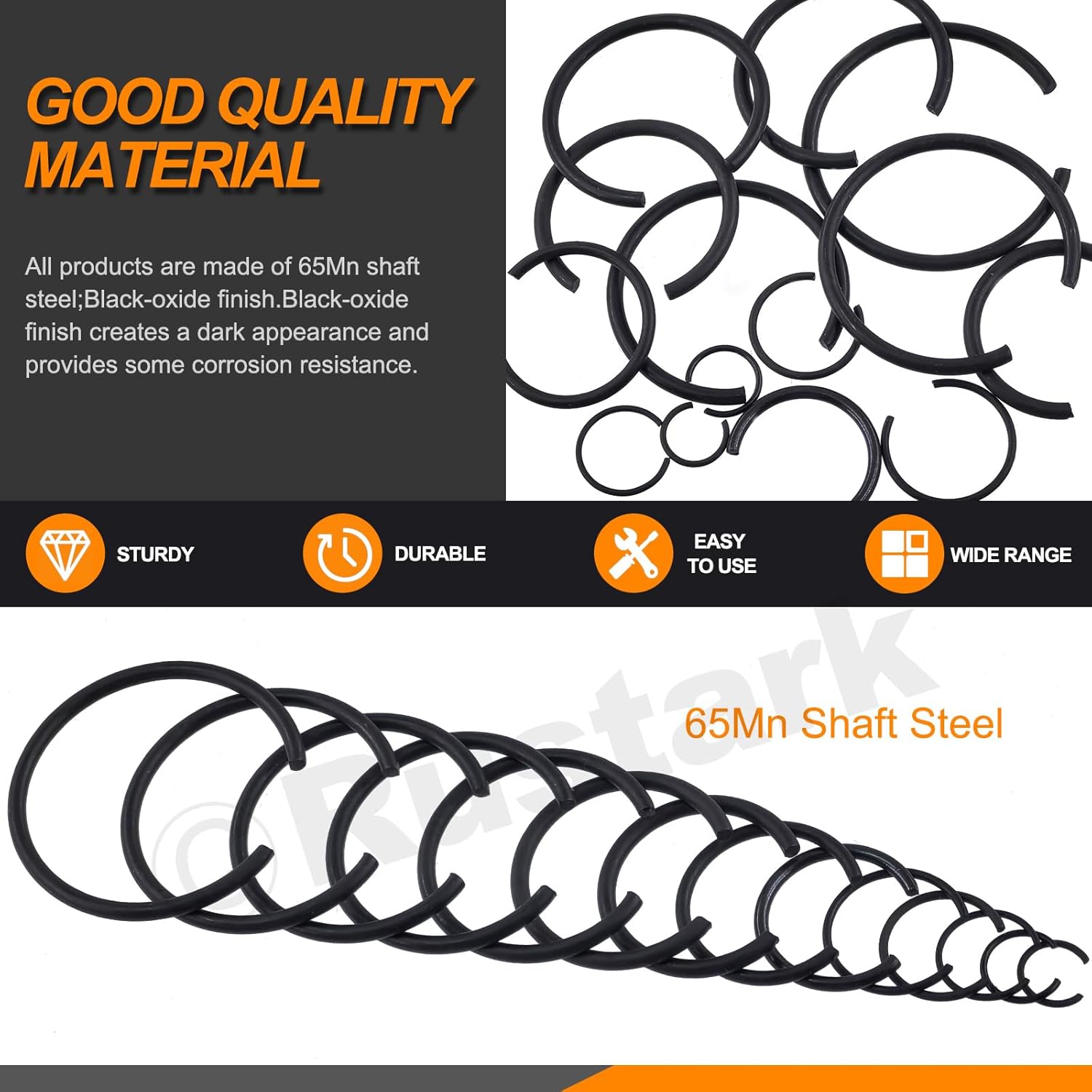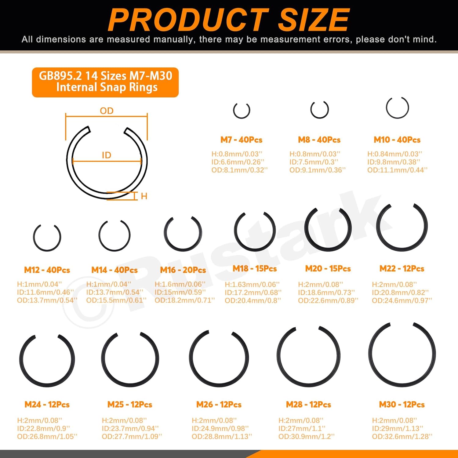 ★Rustark 322Pcs 14 Sizes 65Mn Steel Round Wire C-Clips Snap Rings Assortment Kit Internal Retaining Rings Bearing Stop Ring for Hole - M7 M8 M10 M12 M14 M16 M18 M20 M22 M24 M25 M26 M28 M30 ★ WHY CHOOSE US? ❤You'll receive a 322pcs black 65Mn steel round wire snap rings assortment kit. Sufficient quantity and rich sizes can meet your different needs in daily life. ❤The round wire c clips are made of high quality 65Mn steel with black oxidation treatment which are corrosion resistant, wear resistant, and durable with long-term service life. ❤The round wire snap rings are widely used in industry and machine, instrument and vehicle construction, such as bearing fixation, transmission systems, and telescopic cylinders. ❤The round wire snap rings in various sizes are packed neatly in a separate compartment in a transparent storage box, making it easy to get the right size you need. ★Specifications: ✯Product Type: 65Mn Steel Round Wire Snap Rings for Hole Assortment Kit ✯Quantity: 322pcs ✯Material: 65Mn Steel ✯Color: Black ✯Size: M7, M8, M10, M12, M14, M16, M18, M20, M22, M24, M25, M26, M28, M30; Please see the 2nd picture for more size information. ★What You Get: 40pcs x M7 retaining ring for hole 40pcs x M8 retaining ring for hole 40pcs x M10 retaining ring for hole 40pcs x M12 retaining ring for hole 40pcs x M14 retaining ring for hole 20pcs x M16 retaining ring for hole 15pcs x M18 retaining ring for hole 15pcs x M20 retaining ring for hole 12pcs x M22 retaining ring for hole 12pcs x M24 retaining ring for hole 12pcs x M25 retaining ring for hole 12pcs x M26 retaining ring for hole 12pcs x M28 retaining ring for hole 12pcs x M30 retaining ring for hole Total: 322pcs ❤Warm Tips: -If you come across any questions or problems, please feel free to come to us. We will solve it for you as soon as possible!