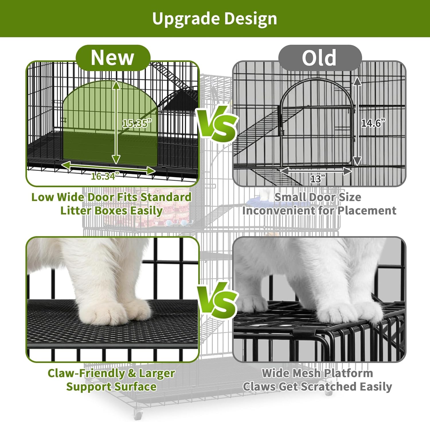 This practical cat cage provides a safe and convenient living space for your cats and serves as a spacious cat playpen for daily activities. It features 2 large storage shelves for organizing cat essentials, 3 paw-friendly flat mesh platforms for comfortable resting, and works as a sturdy cat kennel with an easy-to-clean design, including an extra-large bottom door and mess-catching tray. This functional cat crate offers tool-free assembly in just 10 minutes and supports versatile use for indoor/outdoor settings as well as small pets like rabbits or ferrets.