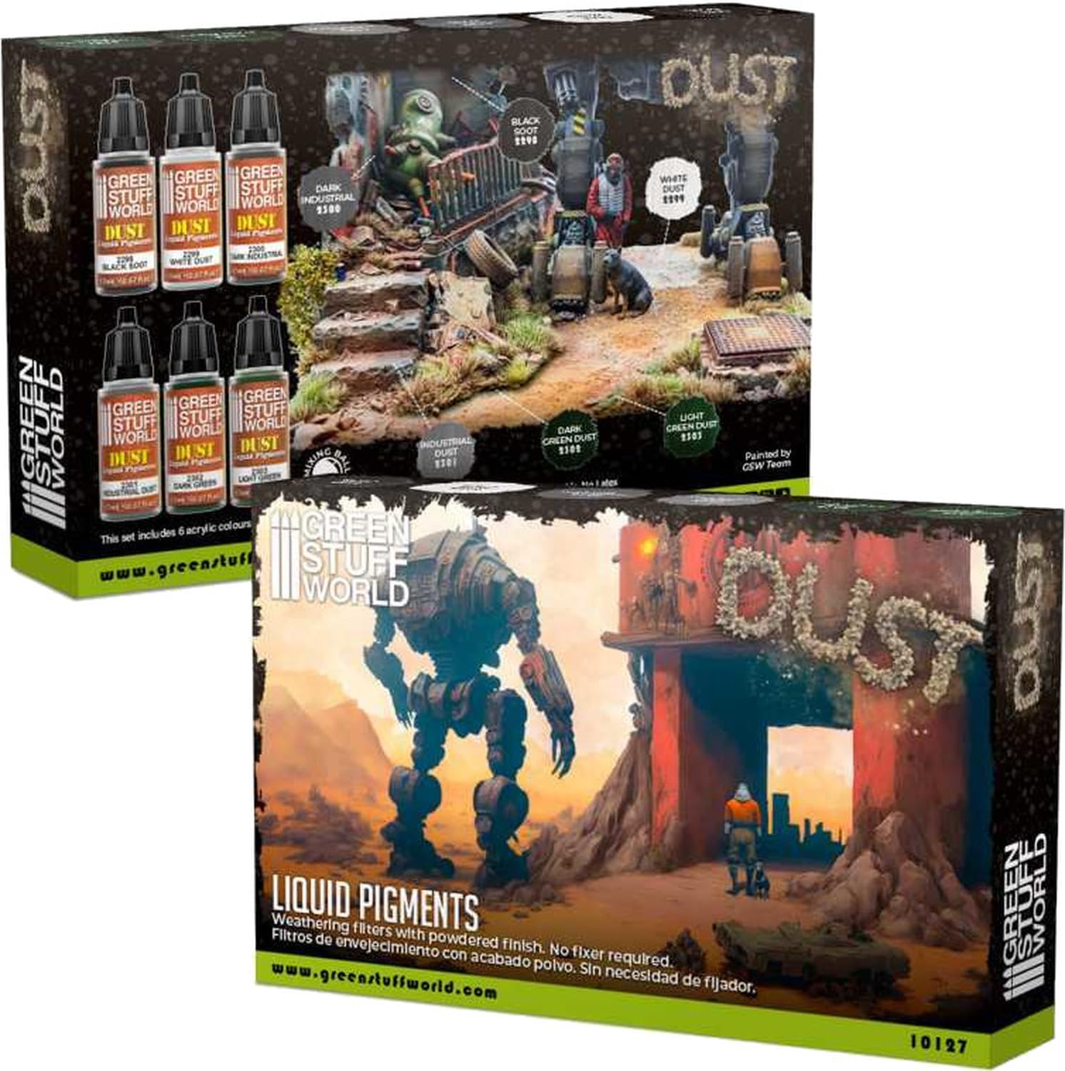Greenstuff World "Acrylic Paint Set Liquid Pigment Dust Color Set 6 Colors" Hobby Paint This all-in-one weathering paint set can reproduce most dust and soot stains. This paint set is made with acrylic paints that have the same effect as powder pigments such as soot dirt and dirt from the exhaust pipe. If using powder pigment for weathering coating, you may need to use a fixing liquid separately. The paint in this set has excellent fixation and fast drying without the need for it. The paint dries to a full matte finish and is non-flammable and does not contain any toxic pigments. Set Contents: 0.6 fl oz (17 ml) of each color, 6 bottles, non-flammable. GSWC-2298 Black Dirt Dust GSWC-2299 White Dust GSWC-2300 Dark Industrial Dust GSWC-2301 Industrial Dust GSWC-2302 Dark Green Dust GSWC-2303 Light Green Dust This product is a hobby paint. Please prepare tools and other items separately. Does not include any other than this product (adhesives, paint, tools, batteries, etc.) Capacity: 0.6 fl oz (17 ml) of each color, 6 bottles