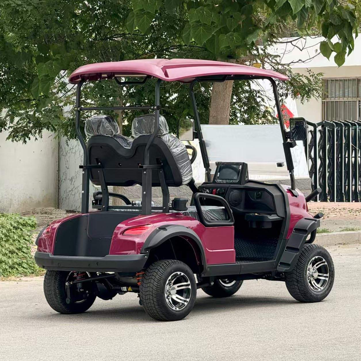 - This 2-seater golf cart is ideal for golf enthusiasts, allowing you to share joyful moments with family and friends. Its spacious and comfortable seating ensures everyone can fully enjoy the game. - Its innovative design combines elegance and practicality, making it easy to maneuver whether youre teeing off on the golf course or cruising around the neighborhood. Specifications: Rated passenger capacity: 2 people Length × Width × Height: 2530*1300*1950 mm Range: 100 km Wheelbase: 1710 mm Front track: 950 mm Rear track: 1030 mm Minimum ground clearance: 142 mm Tires/Wheels: 4-inch tubeless tires, alloy wheels. Driving speed: 25-30 km/h (adjustable) Motor voltage and power: 60V/3.5kW Lights and signals: Headlights, turn signals, reversing lights, taillights, horn. Materials: Body: All-steel frame, injection-molded body Seats: Luxury stitched imitation leather headrest seats, cold-foamed high-resilience sponge, comfortable ride Floor: High wear-resistant, easy-to-clean, rust-proof custom anti-slip floor Package list: * Electric golf cart