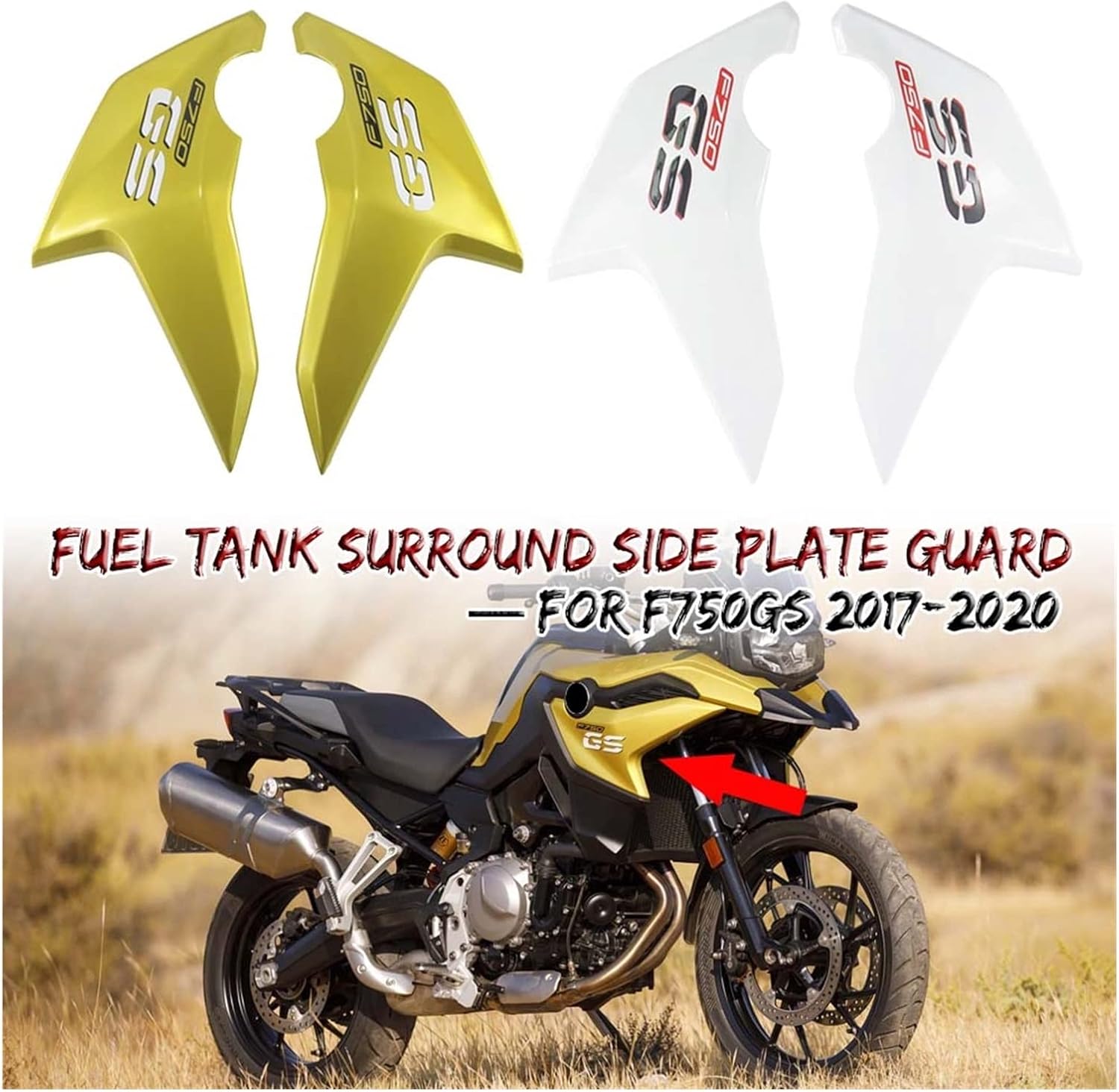 Upgrade your bike's functionality and aesthetic with our Premium Motorcycle Fairing. It comes as a comprehensive kit, providing a one-stop solution for your motorcycle customization needs.For BMW F750GS F750 GS F 750 GS 2017 2018 2019 2020 Motorcycle Fuel Tank Surround Side Plate Guard Left Right Fairing CowlingDescription:1. Item Condition:Brand New2. Material:Imported ABS3. Color: White, Gold4. Placement on Vehicle: Left Side/Right SideFitments:For BMW F750GS 2017-2020Feature:1. Made of ABS injection molding, one-piece molding, precise installation.2. Better protection continue the better appearance of the bicycle.Notes:1. Please Ensure this Parts for Your Motorcycle Before Purchasing.2. The real color of the item may be slightly different from the pictures shown on website caused by many factors such as brightness of your monitor and light brightness.So, revamp your motorcycle with our Premium Motorcycle Fairing and ride with style and efficiency.