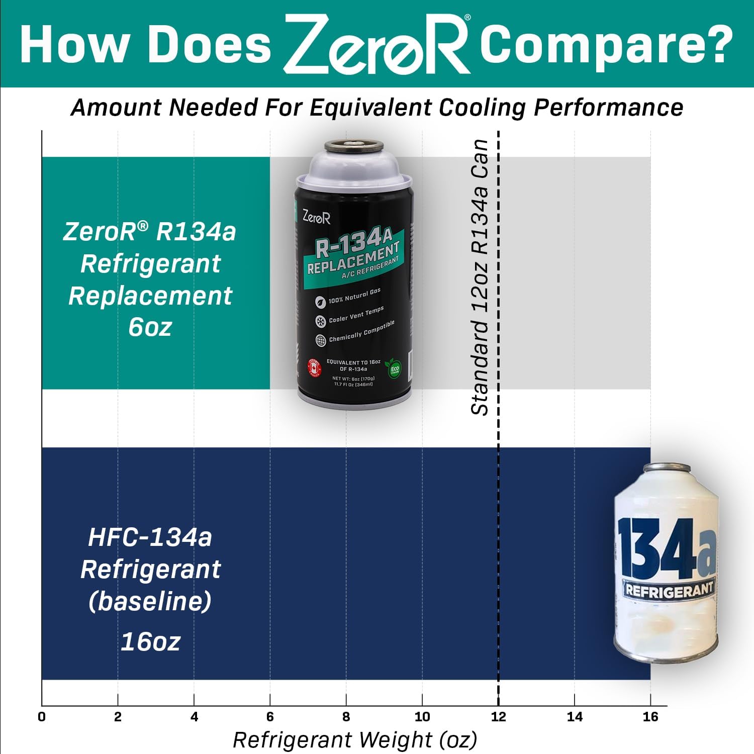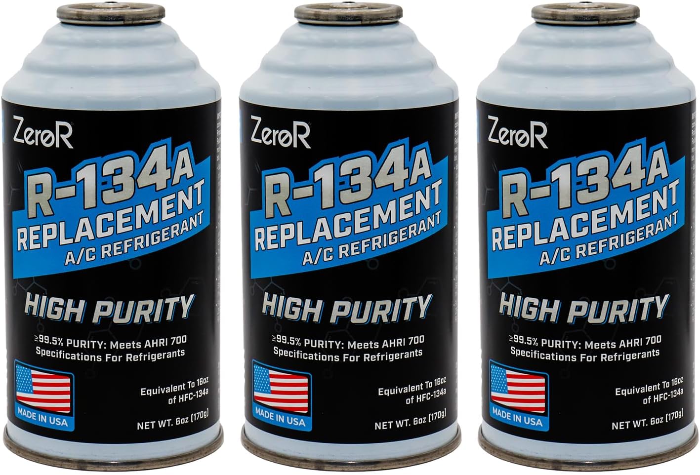 ZeroR is committed to providing innovative, eco-friendly solutions for air conditioning systems. The ZeroR car air conditioner refrigerant is an excellent R134a replacement, designed for high efficiency and environmentally-conscious cooling. Perfect for those who want a cost-effective and sustainable alternative, this car AC recharge can work seamlessly in R134a systems to keep your AC system running at peak performance.Key Features:Eco-Friendly Natural Gas: Made from 100% natural hydrocarbon gas, our refrigerant for car AC offers an environmentally-conscious alternative to traditional refrigerants.R134a-Compatible: Designed for easy installation in R134a systems with compatible threads for standard R134a taps.High-Efficiency Performance: 6oz AC recharge for carprovides the same performance as 16oz of R134a, offering better value and less product waste.Benefits:Effortless Installation: Installs these A/C recharge cans just like standard R134a refrigerant—quick and hassle-free.Cost-Effective: Utilize less refrigerant while maintaining optimal cooling performance.Safe to Use: Rated with a class 2.1 flammability for safe use in approved systems.EPA-Compliant: OurA/C refrigerant cans aresafe and legal for use in R134a systems only, ensuring peace of mind.What’s in the Package:3 Cans of ZeroR AC Refrigerant (6oz each)